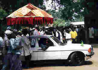 On the morning of February 2, 2001 a crowd of people gathered on the election site not far from the Sandem-naab's palace: chiefs of other Bulsa villages, officers of the Sandema Local Council, Kadema compound heads, policemen, who should guarantee a smooth course of events, petty traders, music bands, curious visitors and of course lots of children of all ages. Between 10 and 11 o'clock the contest-ants, surrounded by their close friends and male relatives arrived on the festival ground. Some time later the Sandemnaab in his white Mercedes with two riders on impetuous horses in front of him and a courtier holding a large red parasol behind the car entered the scene. The Sandema-chief and his retinue sat down in the shade of some trees, beside him the chiefs of other Bulsa-villages and in front of him, facing the group of chiefs the three contestants: Akisibadek Ayukanbe, the late chief's son from Kadema-Gaadem, Anbang-puringnaab, the late chief's father's son and Ajeuk (?), son of Anangaasa from Kadema-Kpikpaluk.
