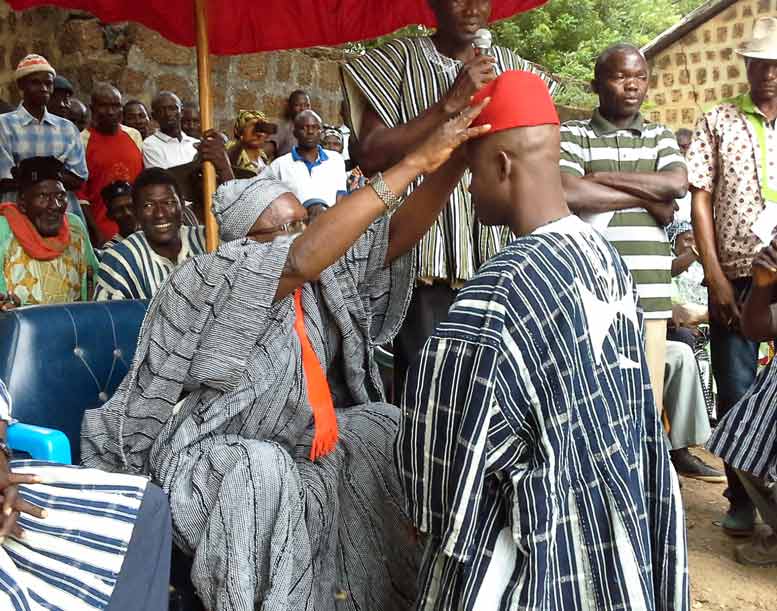 The new chief is "crowned" with a red cap by the Paramount Chief. |