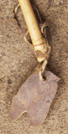 Sometimes the exact meaning and purpose of the objects produced has got lost, even in the minds of Bulsa. Three days after the birth of a boy, the landlord or father of the boy produces an approximately 30 cm long bow (biliok tom) from a millet stalk which is unlikely to function because of its fragility. The bow in my possession is made from a branch of the Nim-tree (Azadirachta indica) while the bows of Bulsa adults are made of bamboo or yuelik-wood (Grewia lasiodiscus). A thin stalk and a nail with the head removed or bicycle spoke instead of a barbed iron top are used to represent the arrow. Such a bow remains hanging on a wall